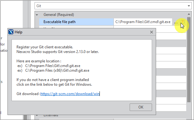 "User execute file path" 항목 오른쪽에 [?] 버튼을 클릭하면 SVN 클라이언트 설치에 필요한 정보를 확인할 수 있습니다.