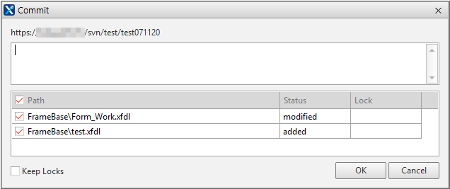 로컬 저장소에서 Commit 할 수 있는 대상 목록을 표시합니다. Commit 메시지 입력 후 Commit 버튼을 클릭하면 로컬 저장소로 Commit을 실행합니다.