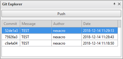 원격 저장소가 연결되어 있는 경우, 원격 저장소로 발행되지 않은 Commit 항목을 표시합니다. Push 버튼을 클릭하면 원격 저장소로 발행할 수 있습니다.
