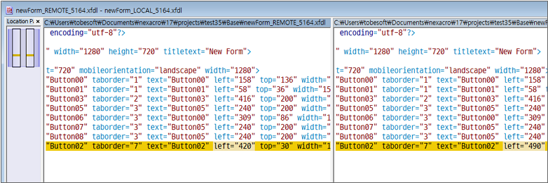 충돌이 발생한 파일은 넥사크로 스튜디오 XML 에디터로 열립니다. "HEAD" 아래 있는 코드가 Pull 명령 수행 전 Local Repository에 Commit 된 코드입니다. "=======" 아래 있는 코드는 Remote Repository에서 가져온 코드입니다. 변경된 코드를 확인하고 수정하면 충돌을 해결할 수 있습니다.