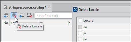 더 이상 사용하지 않는 언어 칼럼은 삭제할 수 있습니다. 툴바에서 [Delete Locale] 아이콘을 클릭하면 현재 설정된 언어 칼럼 목록이 표시되고 삭제할 언어를 선택할 수 있습니다. 영어(en)는 기본값이기 때문에 삭제할 수 없습니다.