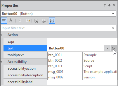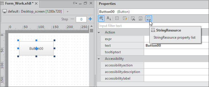 컴포넌트 선택 후 속성창 툴바에서 [StringResource] 항목을 선택하면 다국어를 적용할 수 있는 속성 목록이 표시됩니다. 컴포넌트 속성 중 텍스트를 설정할 수 있는 속성들이 표시됩니다.