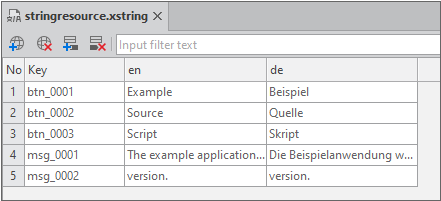 툴바에서 [Add Key] 아이콘을 클릭하면 빈 행이 추가됩니다. 추가된 행에서 Key 값을 수정하고 각 언어 칼럼에 적절한 값을 입력합니다.