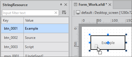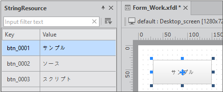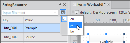 메뉴 [View > StringResource] 항목을 선택하면 StringResource 창이 표시됩니다. 적용할 Key 항목을 선택하고 컴포넌트 위로 드래그 앤 드롭하면 선택한 Key에 해당하는 문자열이 컴포넌트의 기본 다국어 속성값으로 설정됩니다.
