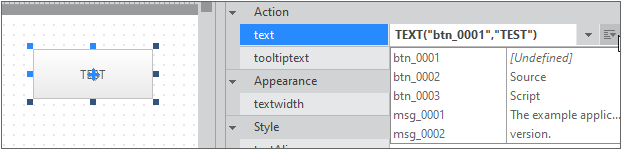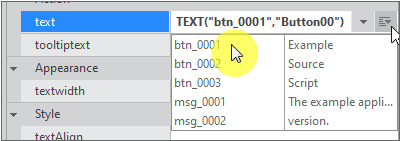속성창 오른쪽에 버튼을 클릭하면 StringResource에 추가한 Key 목록이 표시됩니다. Key 값을 선택하면 선택한 값이 컴포넌트의 속성값으로 반영됩니다.