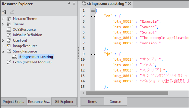 StringResource 데이터는 JSON 형식으로 저장됩니다. Source 탭을 선택하면 생성한 데이터를 확인할 수 있습니다.