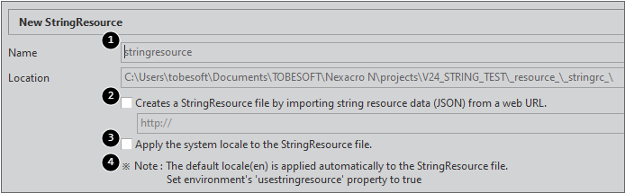 1 | Name, Location | StringResource는 프로젝트 내 1개만 만들 수 있습니다. 이름과 파일 생성 경로는 기본값으로 설정되며 수정할 수 없습니다. |