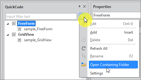 QuickCode 패널에서 View Template 탭을 열고 상단 메뉴 버튼을 클릭하고 [Open Containing Folder] 항목을 선택하면 해당 폴더를 열어줍니다.