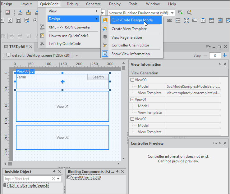 메뉴 [QuickCode > Design > QuickCode Design Mode] 항목을 선택하거나 툴바에서 QuickCode Design Mode 항목을 선택하면 QuickCode Design Mode가 활성화됩니다. Form 화면 오른쪽에 VIew Information 패널이 표시되고 각 View 오브젝트에 대한 정보를 표시합니다.