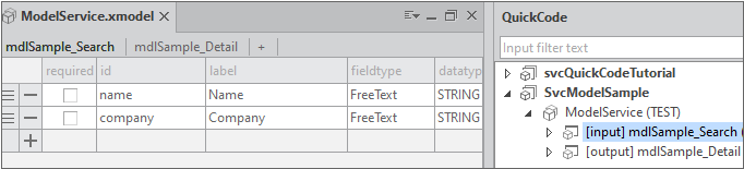 QuickCode 패널에서 Model(mdlSample_Detail)을 선택하고 두 번째 View 컴포넌트에 끌어다 놓습니다.