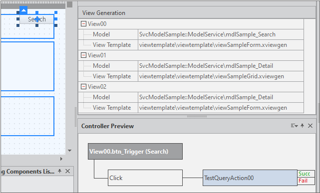 선택한 TestQueryAction 항목을 첫 번째 View 컴포넌트에 배치된 'Search' Button 컴포넌트에 끌어다 놓습니다.