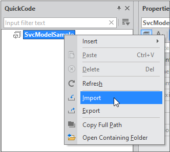 QuickCode 패널에서 Model 탭을 선택하고 컨텍스트 메뉴에서 "Import" 항목을 선택합니다.