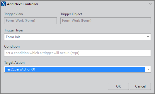 Trigger Type 항목은 "Form Init", Target Action 항목은 "TestQueryAction00"을 선택하고 [OK] 버튼을 클릭합니다.