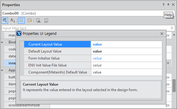 최초 앱이 실행했을 때만 지정된 속성값을 사용하고 이후에는 사용자가 입력하거나 실행 중 변경된 값을 사용해야 하는 경우가 있습니다. 그런 항목값은 Init Info 속성으로 별도 관리합니다. 속성값 중 Layout Information에 해당하는 값을 제외한 나머지 값 중에서 일부 항목만 편집할 수 있습니다.