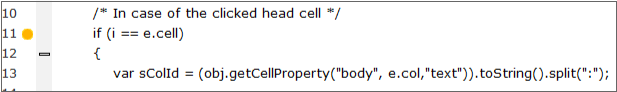 중단점을 추가하려면 스크립트 편집 창이 활성화된 상태에서 툴바의 Toggle Breakpoint 선택 시 편집 창의 커서 위치에 마커를 추가하고 Breakpoints창에 중단점 정보를 추가합니다.