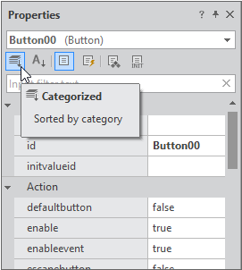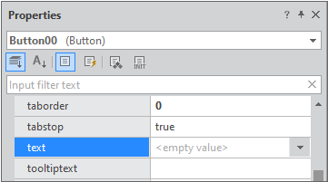 선택된 오브젝트의 속성이나 이벤트를 범주로 정렬해 편집합니다. 편집할 때는 그림과 같이 '▶'나 '▼'를 마우스로 클릭하여 범주 항목을 펼치거나 접을 수 있습니다.