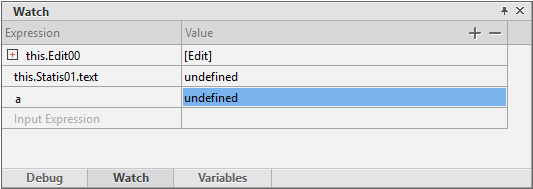 오브젝트나 변수를 Watch로 추가하려면 Watch 창에서 + 버튼을 클릭하거나 마지막 행(Input Expression)을 더블 클릭합니다. 스크립트 편집기에서도 추가가 가능한데 오브젝트나 변수 명을 마우스로 드래그하여 선택 후 Watch 창으로 드래그 앤 드롭하거나 마우스 오른쪽 버튼을 클릭하여 콘텍스트 메뉴에서 Add Text to Watch를 선택합니다.