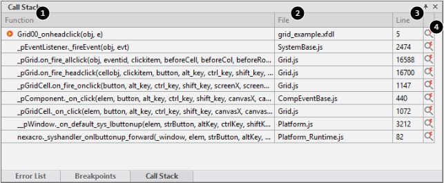 현재 위치까지 호출된 함수를 역순으로 표시합니다. 해당 항목을 더블 클릭하면 이벤트를 호출한 위치의 코드로 이동합니다.