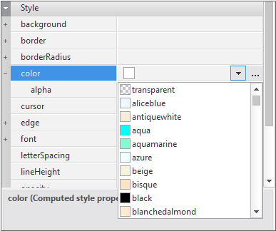 색상 관련 속성값을 선택하는 경우에 색상 목록에서 선택하거나 Color Picker를 사용할 수 있습니다.