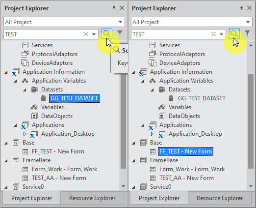 'TEST'라는 검색어를 입력하고 검색 아이콘을 클릭하면 Application Variables의 Dataset 오브젝트와 Base 서비스 내에 있는 Form 중에서 'TEST'가 포함된 항목을 차례로 선택합니다.