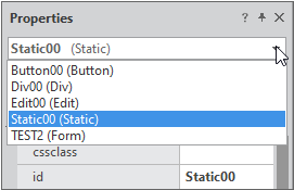 편집 중인 Form에 포함된 모든 컴포넌트, Dataset 등을 id 값 (오브젝트 명) 목록으로 보여줍니다. 선택한 오브젝트에 따라 아래의 속성, 이벤트 등의 목록에 다르게 표시됩니다. 디자인 화면에서 특정 오브젝트를 선택할 수도 있습니다.