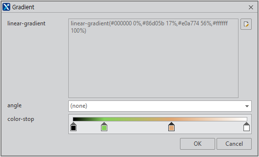 색상 속성값 지정 시 linear-gradient 속성을 편집하는 경우에 사용합니다. [angle] 항목에서 그라데이션을 적용할 방향을 지정하고 [color-stop] 항목에서 그라데이션 색상을 지정할 수 있습니다. 그라데이션 색상 지정 시에는 [Color Picker]를 사용합니다.