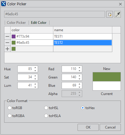 Color Picker를 사용하면 다양한 형식으로 색상값을 지정할 수 있으며 Edit Color를 저장해놓고 재사용할 수 있습니다.