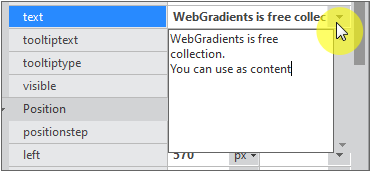 속성값에 여러 줄의 텍스트를 입력할 수 있는 경우에는 속성 입력창 오른쪽에 드롭다운 버튼이 표시됩니다. 버튼을 클릭하면 여러 줄 텍스트를 편집할 수 있는 창이 표시됩니다. 줄을 바꿀 때에는 Ctrl+ENTER 키를 입력합니다.