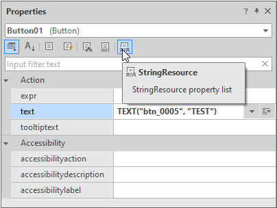 다국어를 적용하려는 경우 컴포넌트의 텍스트 관련 속성값을 StringResource에서 참조하도록 설정할 수 있습니다. 다국어 설정을 지원하는 속성 목록만 표시됩니다.