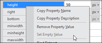 컴포넌트의 속성 중 문자열 형태의 속성일 경우에만 empty value 표시를 지원합니다. 예를 들어 position 관련 속성은 문자열이 아니라 숫자형으로 속성값을 처리하기 때문에 컨텍스트 메뉴에서 Set Empty Value 항목이 비활성화됩니다.