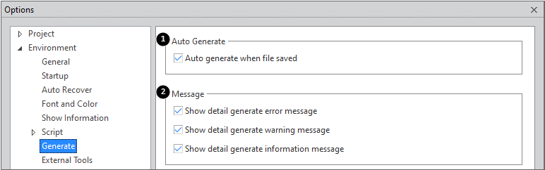 Generate 실행하기 전 또는 실행된 후 지정된 명령을 수행하고 결과를 Output 창에 표시합니다.