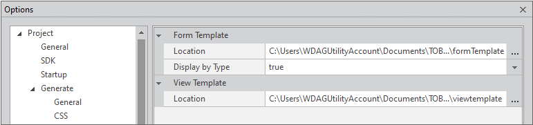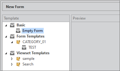 Display by Type 항목은 Form Wizard에서 Template이 표시되는 형식을 설정합니다. 기본값(true)인 경우에는 아래와 같이 Form Templates와 Viewset Templates를 구분해 표시하고 false로 설정한 경우에는 구분없이 폴더명순으로 표시합니다.
