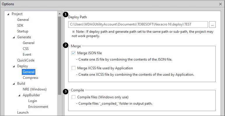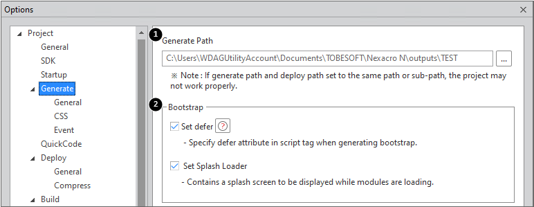 프로젝트 Build 시 생성된 파일이 저장되는 경로를 지정합니다. Generate 경로를 Deploy 경로와 동일한 경로나 하위 경로로 설정하면 프로젝트가 제대로 동작하지 않을 수 있습니다.