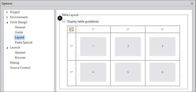 Form 디자인 화면의 눈금자와 가이드 라인, Grid, Snap 기능에 대한 옵션을 설정합니다.