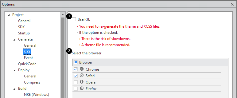 Use RTL 옵션을 체크한 경우 Application XCSS 파일은 generate 과정에서 모든 선택자에 대한 RTL 지원을 추가하면서 파일 크기가 커질 수 있으며 이로 인해 앱 실행 시 성능에 영향을 미칠 수 있습니다.