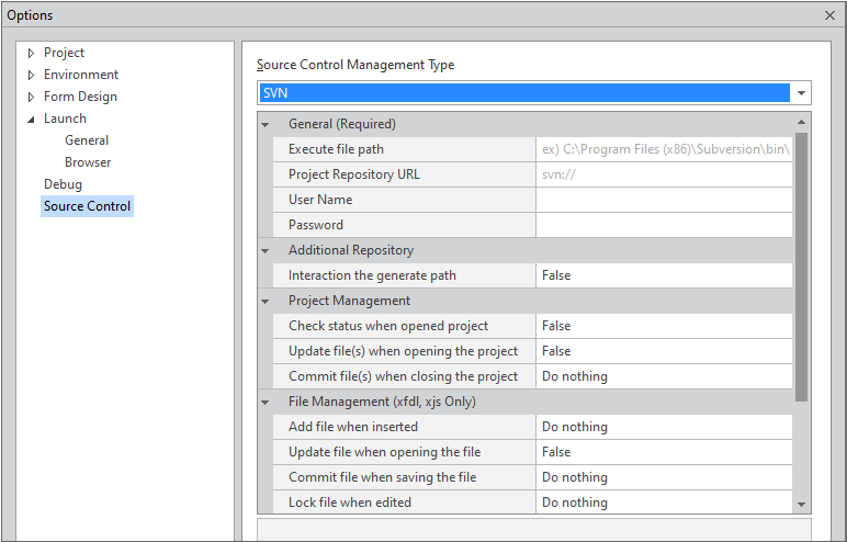 Source Control과 관련된 Option을 설정합니다. 해당 Option은 사용자 PC에 사용 가능한 Source Control이 설치된 경우에만 보입니다.