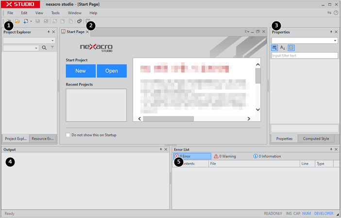nexacro studioのインストール後、初回起動時には、プロジェクトを開いていない状態です。