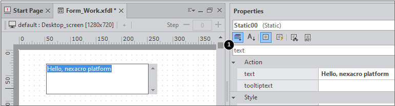 nexacro platformアプリで文字を表示するときは、Staticコンポーネントを使用します。'Objects'ツールバーで、Staticコンポーネントをマウスで選択し、Form Designウィンドウで任意の場所をマウスでクリックすると、デフォルト値として設定されているサイズのStaticコンポーネントが配置されます。