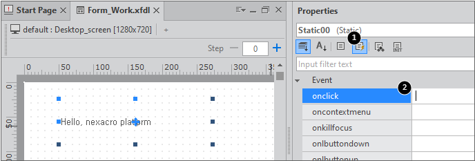 nexacro studioでStaticコンポーネントを選択し、プロパティウィンドウから1[Event]アイコンを選択した後、onclick項目の2入力ウィンドウをダブルクリックします。