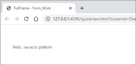 "Hello, nexacro platform"라는 텍스트 영역을 클릭하면 아래와 같이 경고창이 표시됩니다.