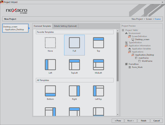 Frame項目は「Full」オプションを選択します。「Full」オプションを選択すると、基本フレーム構造とFormを生成します。Screen関連の設定やFrameの設定は、プロジェクトの作成後に変更することができます。[Finish]ボタンをクリックしてプロジェクトを作成します。