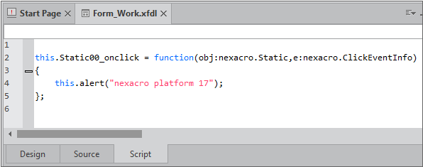 nexacro studioでクリックイベントを追加するときは、Form Designウィンドウで該当コンポーネントをダブルクリックしてください。Form Scriptウィンドウに切り替えながらイベントを指定する関数がタスクウィンドウに自動的に作成されます。