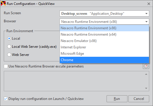 웹브라우저를 선택하면 Run Enviroment 항목이 Local Web Server로 변경됩니다. [Run] 버튼을 클릭합니다.