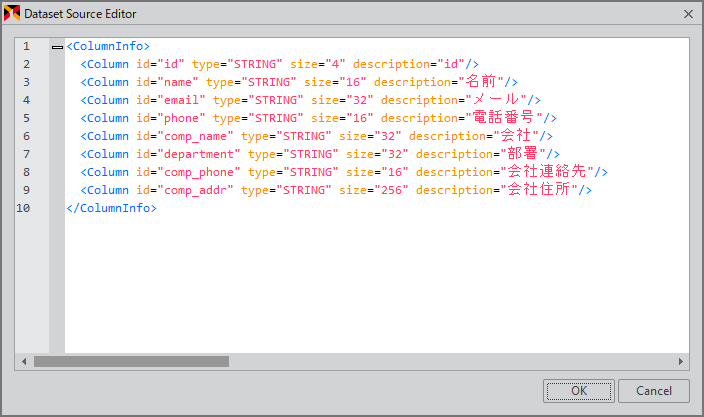 <ColumnInfo> <Column id="id" type="STRING" size="4" description="id"/> <Column id="name" type="STRING" size="16" description="名前"/> <Column id="email" type="STRING" size="32" description="メール"/> <Column id="phone" type="STRING" size="16" description="電話番号"/> <Column id="comp_name" type="STRING" size="32" description="会社"/> <Column id="department" type="STRING" size="32" description="部署"/> <Column id="comp_phone" type="STRING" size="16" description="会社連絡先"/> <Column id="comp_addr" type="STRING" size="256" description="会社住所"/> </ColumnInfo>