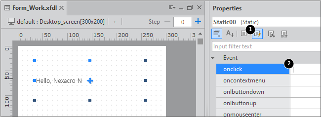 nexacro studioでStaticコンポーネントを選択し、プロパティウィンドウから1[Event]アイコンを選択した後、onclick項目の2入力ウィンドウをダブルクリックします。