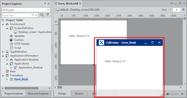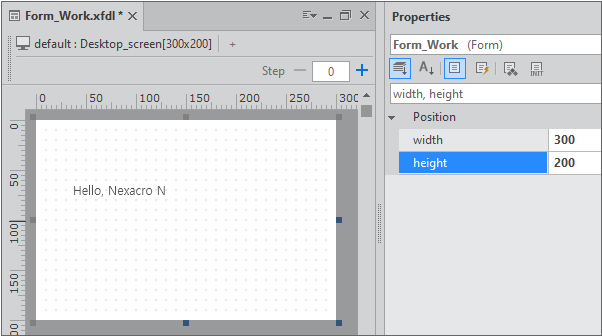 デザイン画面でStaticコンポーネント以外の領域をクリックすることで、Formが選択されます。プロパティリストでwidth、heightプロパティ値をそれぞれ300、200に修正し、保存します。
