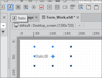 Nexacroアプリで文字を表示するときは、Staticコンポーネントを使用します。'Objects'ツールバーで、Staticコンポーネントをマウスで選択し、Form Designウィンドウで任意の場所をマウスでクリックすると、デフォルト値として設定されているサイズのStaticコンポーネントが配置されます。