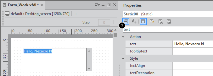 変更するプロパティ名を知っている場合には、検索する文字列を1番ウィンドウに入力すると、目的の項目をすぐに見つけることができます。今回の例では、「text」という文字列を入力しました。そして、textプロパティ値を「Hello, Nexacro N」に修正します。