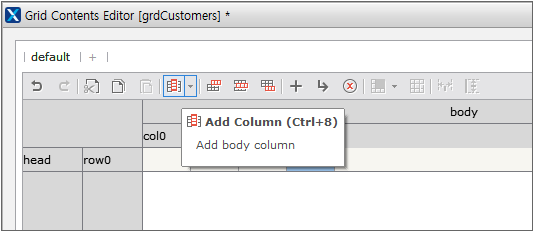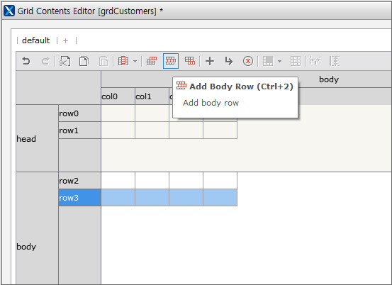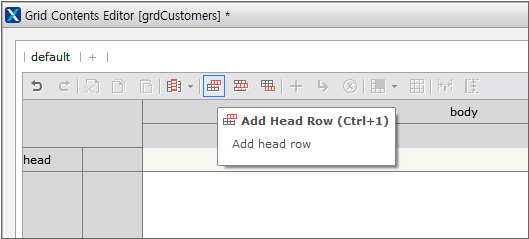 まず、頭行を追加します。グリッド・コンテンツ・エディタの上部のツールバーで、[Add Head Row]項目を選択します。