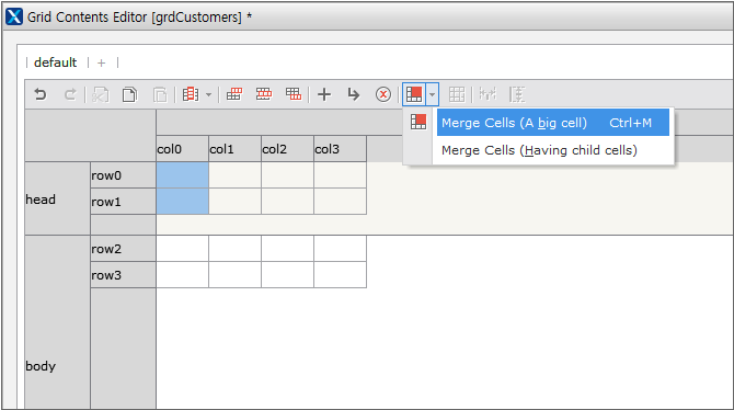 col0とcol1カラムは、一つのデータのみをリンクしてくれるので、セルを結合する必要があります。 col0の頭行にあるセルを選択し、エディタのツールバーの[Merge Cells]項目を選択します。複数のセルを選択するときは、いずれかのセルを選択した後、マウスをドラッグするか、Shiftキーを押しながら別のセルを選択します。